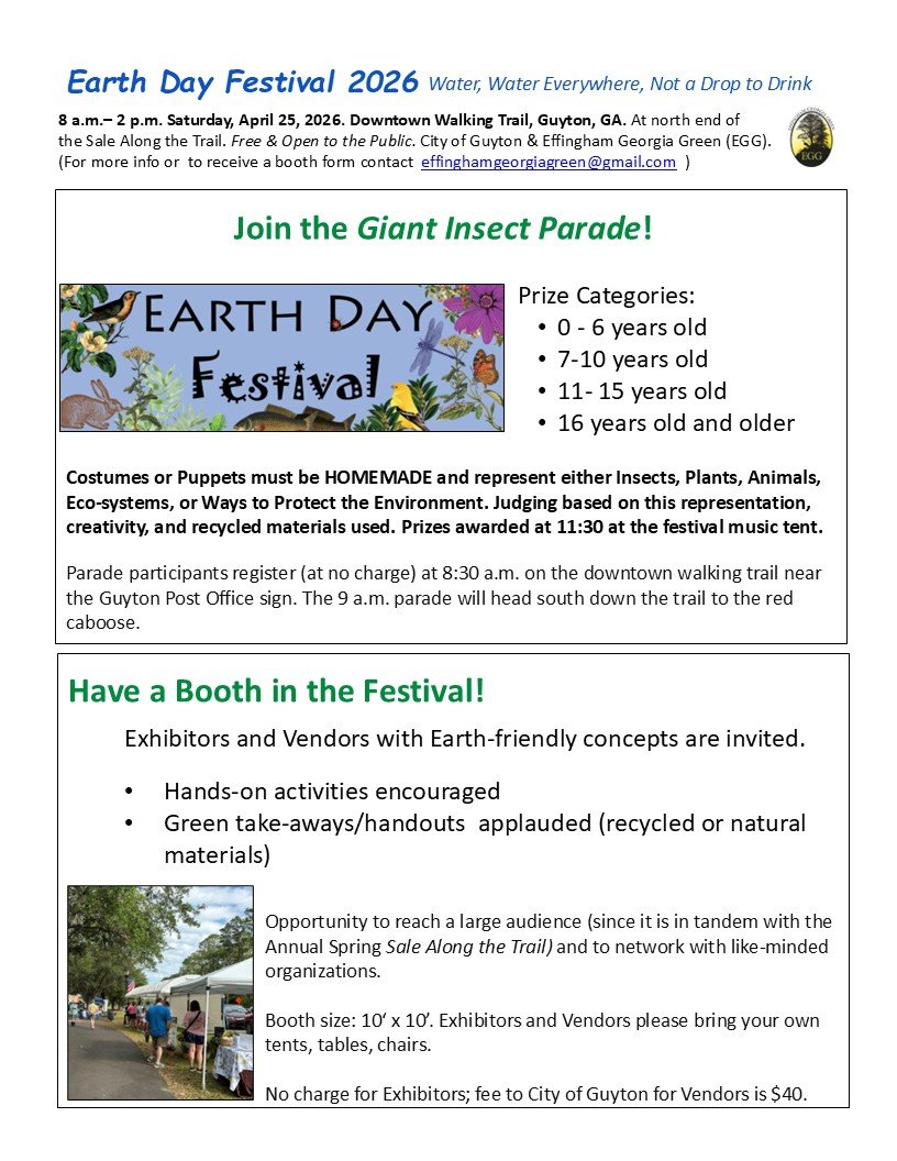 Hands on and immersive activities! Green vendors! Live music! Make and Takes! Prizes! GIANT Insect Parade! Green egg ("water drop" hunt!) And more. Play, learn, have fun. Come to the Earth Day Festival 2026, Guyton, Georgia. Free and open to the public.